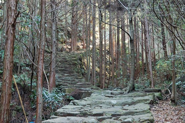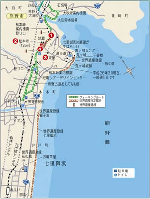 ■コースの特徴/ほとんどの道に美しい石畳が残り、竹林に囲まれた峠では、等身大ほどの大きなお地蔵様が出迎えてくれます。松本峠を越えれば、浜街道を経て新宮まで峠越えはありません。かつての巡礼者が、七里御浜の向こうの新宮に鎮座する熊野速玉大社に思いを馳せたであろう場所です。鬼ヶ城跡から鬼ヶ城センターへ遊歩道を下ると、大泊駅へ戻るショートコースになります。