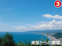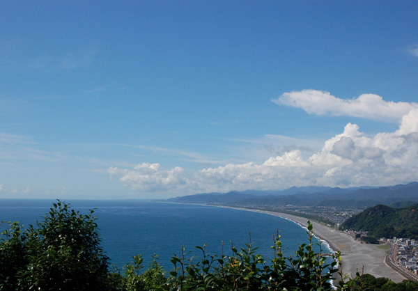 峠から約10分程東へ歩くと、熊野速玉大社がある新宮まで約25kmも続く七里御浜と、山並みが一望できます。