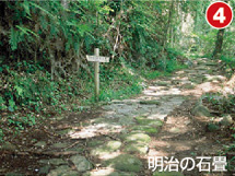 時折真っ赤なカニも横切る、苔むした石畳を歩きます。石畳の側面が見事な石垣で固められています。