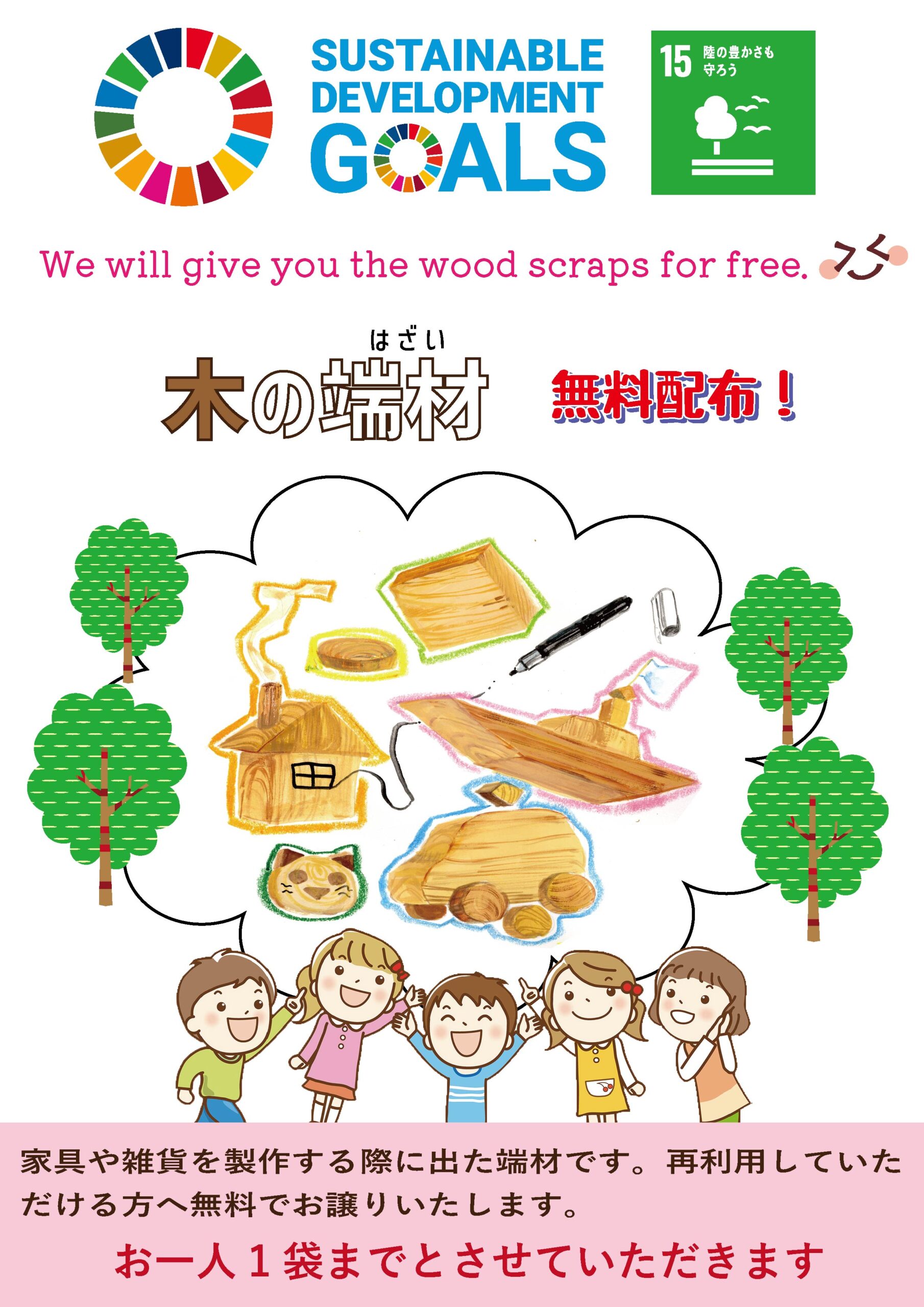 家具や雑貨んどを製作する際に出た端材を、無料でお譲りします。冬休みの工作などにご活用ください。(お一人一袋まで)