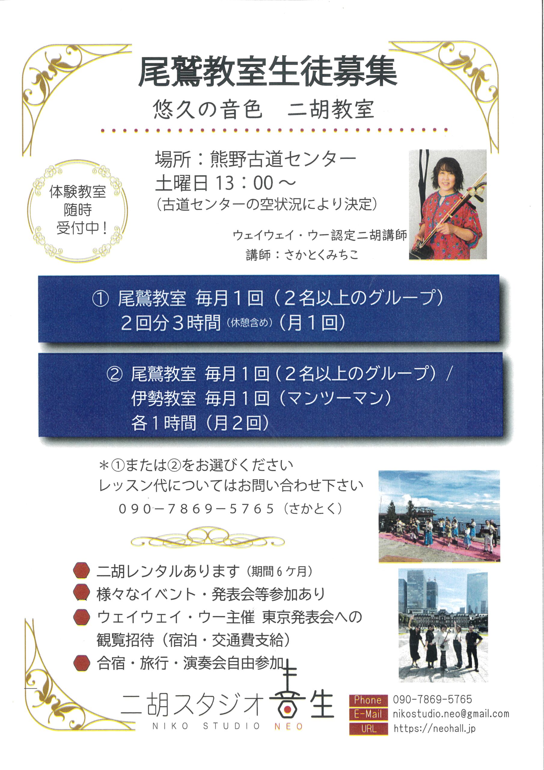 ウェイウェイ・ウー認定二胡講師 さかとく みちこ先生の尾鷲教室が開講中です。