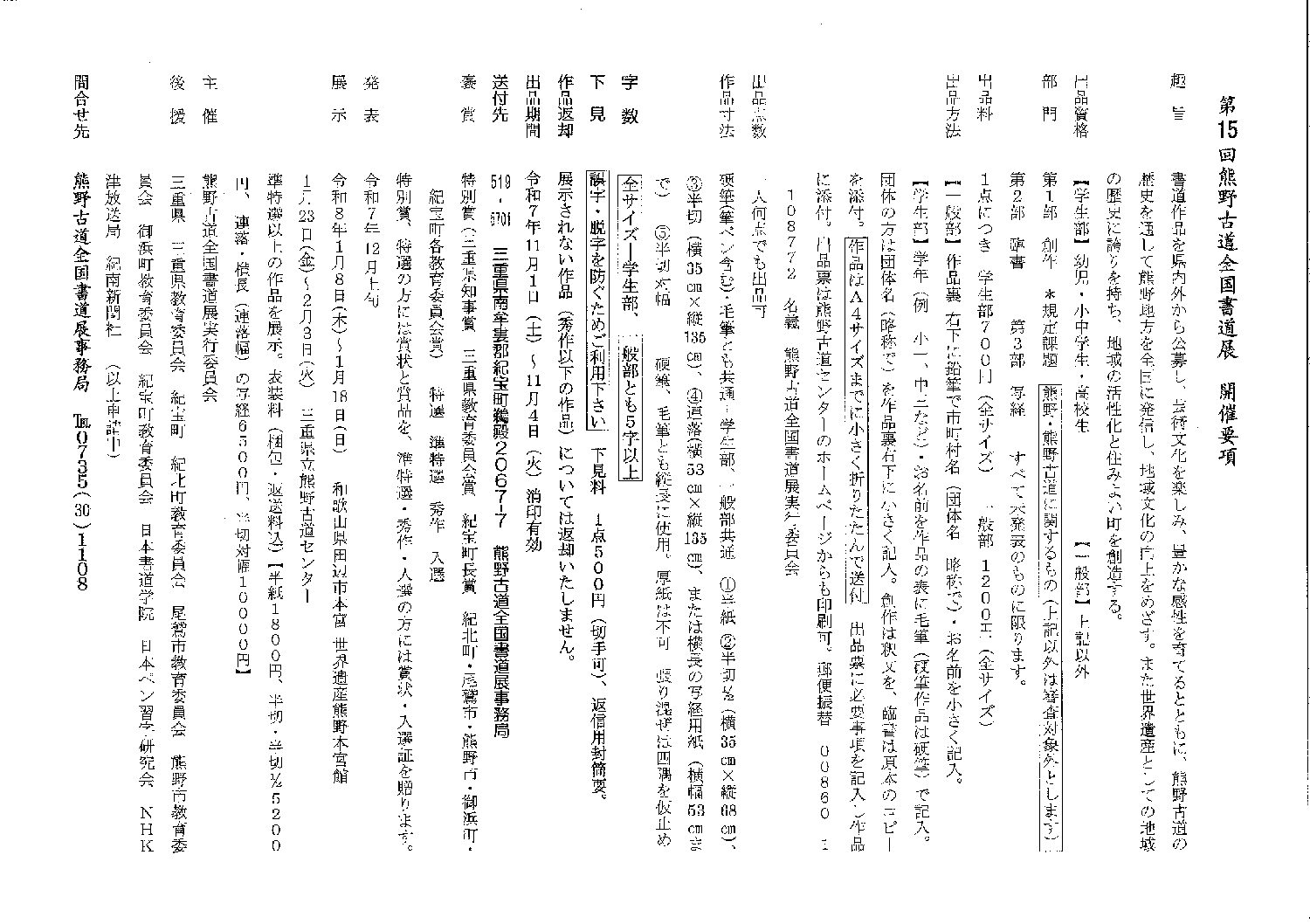 | 備考欄 | 問合せ先:熊野古道全国書道展事務局 Tel:0735-30-1108 後援:三重県、三重県教育委員会、紀宝町、NHK津放送局など |