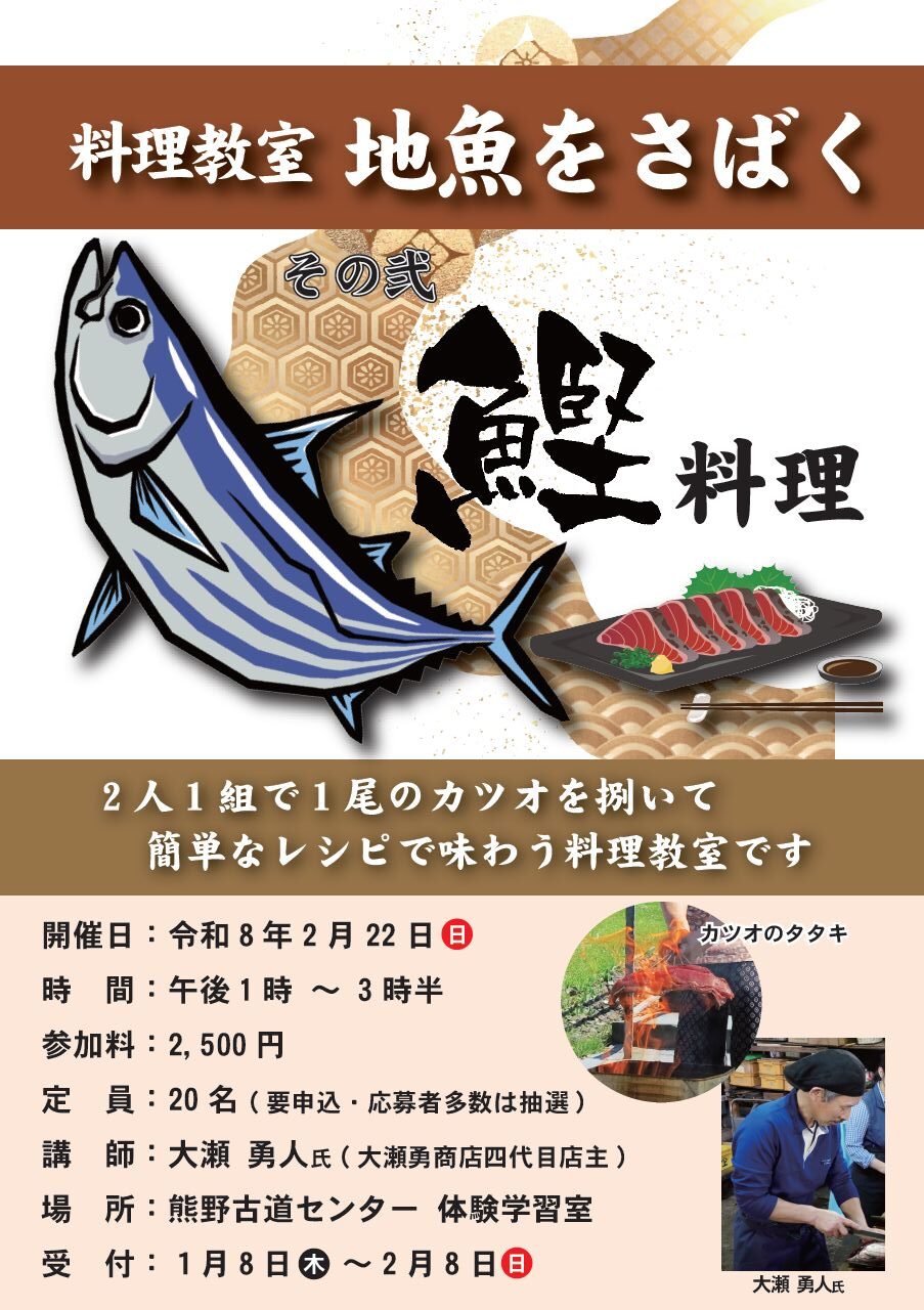 第2回は、尾鷲市で明治より操業の老舗の海産加工店「大瀬勇商店」の代表大瀬 勇人氏を講師に招き、カツオのタタキなど、カツオを捌いて味わう料理教室を開催します。講師の指導の下、2人一組で一尾のカツオを捌き、片身づつ料理して味わっていただきます。
